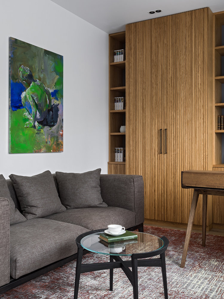 В кабинете разместили стеллажи для книг и документов, а также органично вписали в общую композицию шкаф для деловых костюмов хозяина дома.