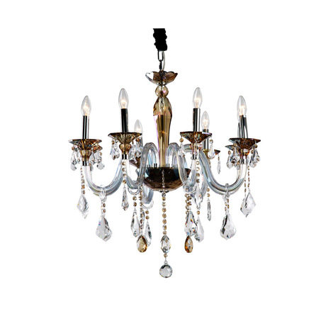 Красивая, благородная люстра из прозрачного и цветного стекла. Хромированное основание одето в стекло белого и коньячного цвета. Ромбовидные подвесы на длинных гирляндах. Рассчитана на 8 ламп с цоколем Е14.