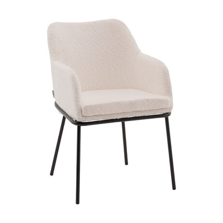 Стул с подлокотниками Кози — это сочетание мягких форм и обволакивающего комфорта. Обивка из нежной ткани букле в молочном оттенке добавляет интерьеру уюта и визуального тепла, а округлая форма спинки и подлокотников будто приглашает присесть и расслабиться. Чёрный металлический каркас подчёркивает графичность силуэта и придаёт модели современный акцент.Продуманная эргономикаГлубина посадки 62 см в сочетании с высокой спинкой и подлокотниками создаёт комфортную поддержку для спины и рук. Стул идеально подойдёт для длительного сидения — будь то в домашнем кабинете, уютной кофейне или в зале ожидания. Прочная конструкция выдерживает нагрузку до 120 кг, оставаясь при этом лёгкой и элегантной внешне.