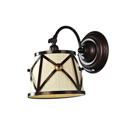 светильник настенный, металлический каркас по стилю напоминает ковку, «золотые» элементы на абажуре разбавляют чёрно-коричневую цветовую гамму металла, плотная ткань с лёгким кремовым оттенком мягко рассеивает свет