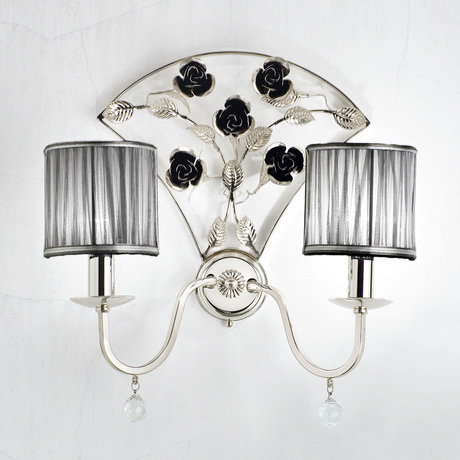 Настенный светильник серии PARIS выполнен из хромированного металла. Два световых элемента расположены под абажурами из органзы черного цвета. Бра декорировано элементами в виде листьев и стеблей, обработанных методом воздушно-плазменной резки металла и керамическими розочками черного цвета, а также украшена подвесками из хрусталя Swarovski. По индивидуальному заказу возможны различные модификации и варианты отделки.